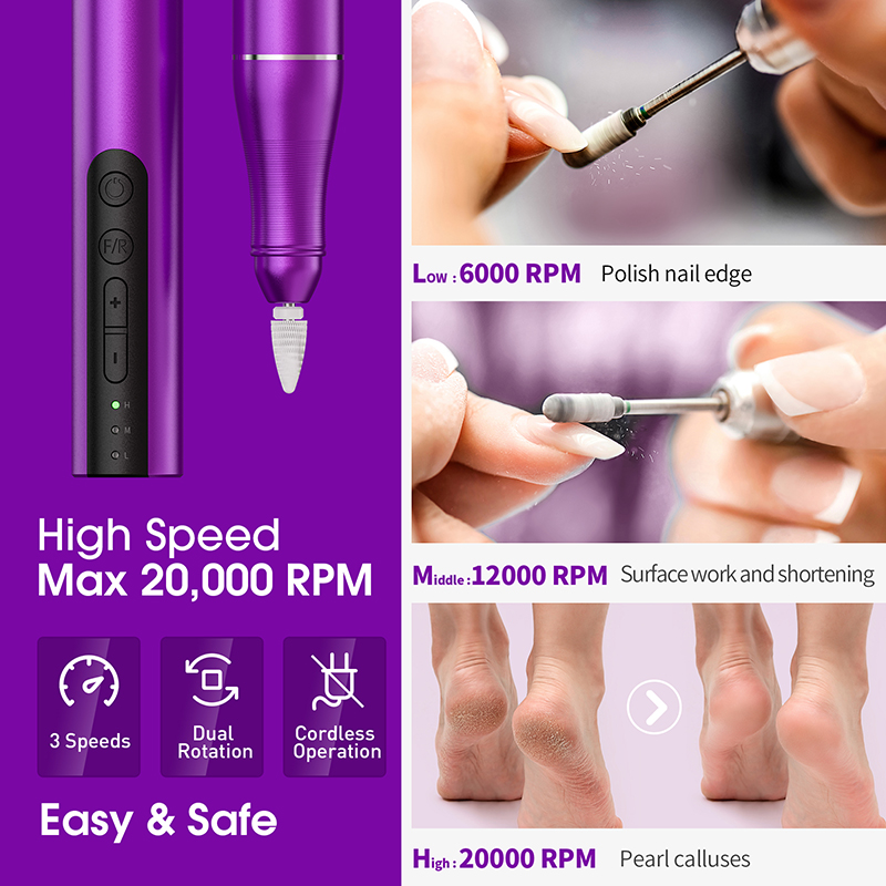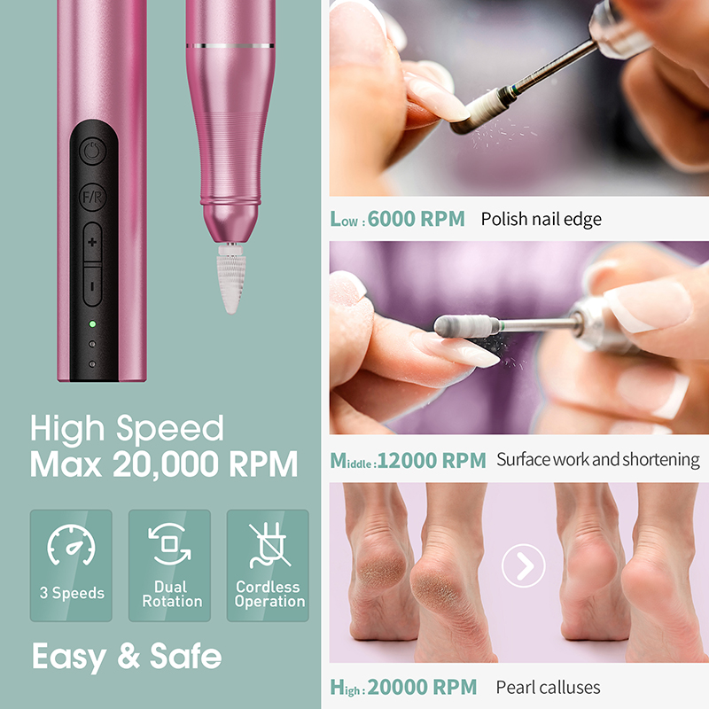 Profesionalne turpije za nokte dizajnirane su sa 3 brzine od 6000-12000-20000, samo kratko pritisnite dugme + ili - da povećate ili smanjite brzinu. Lako se podešava brzina i štedi vrijeme prilikom oštrenja noktiju. Smjer bušilice može se lako promijeniti pritiskom na tipku F/R, idealno za ljevoruke, majstore noktiju ili početnike za njegu noktiju.
