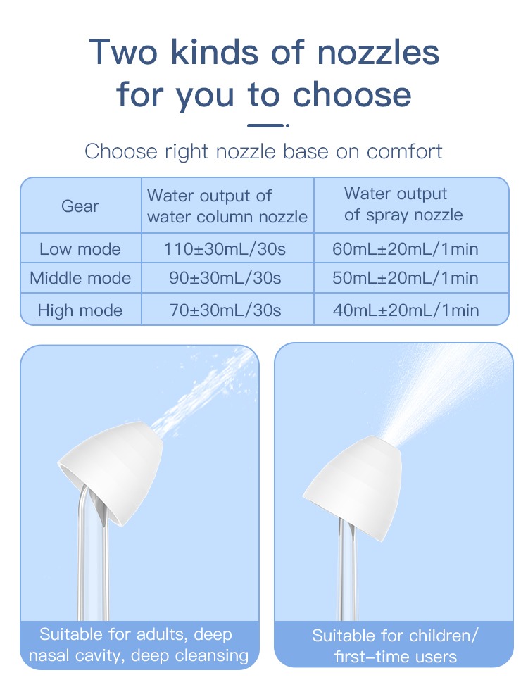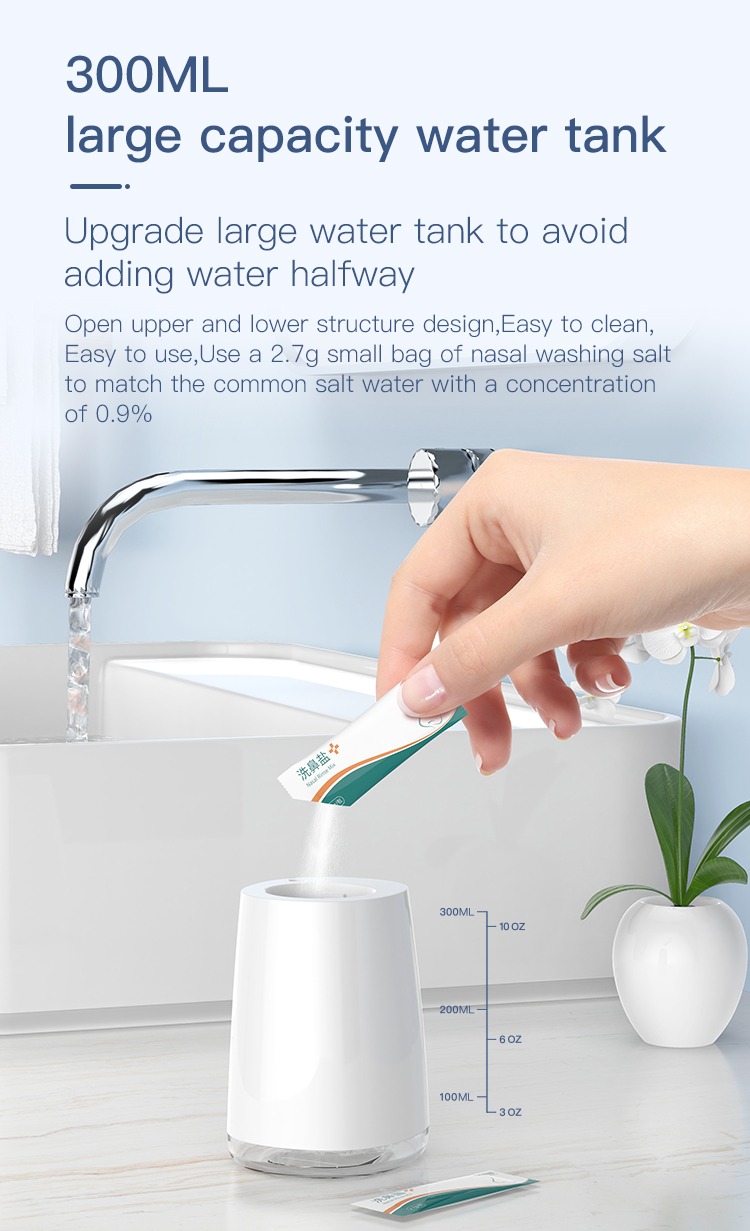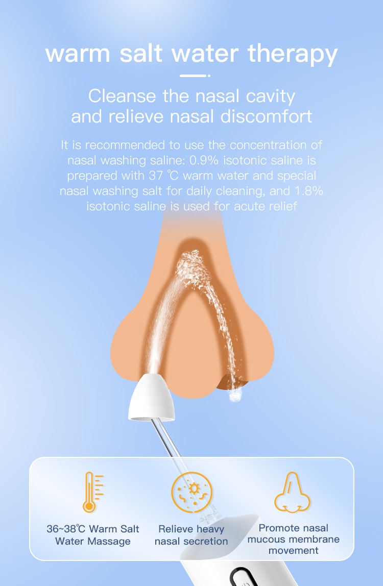 【Rotirajući vrhovi za 90 stupnjeva】 Dizajn rotirajućih vrhova za 360 stupnjeva nazalnog čistača je učinkovitiji od Neti lonca ili drugih uređaja za ispiranje nosa. Sa IPX7 vodootpornim dizajnom, uređaj za ispiranje nosa omogućava ispiranje cijelog tijela vodom, što je lakše za čišćenje i njegu vaše nosne šupljine. |
