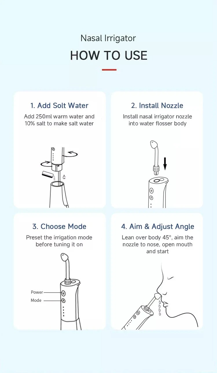 Efikasno ispiranje nosa: Električni nazalni irigatori nude efikasno i temeljito navodnjavanje nosnih prolaza, pomažući da se ispiru sluz, alergeni i ostaci efikasnije od ručnih metoda. Pogodnost: Sa svojim pogonom i podesivim postavkama, električni irigatori za nos pružaju praktično rješenje za ispiranje nosa, štedi vrijeme i trud korisnika u poređenju sa tehnikama ručnog navodnjavanja. Prilagođavanje: Podesiva podešavanja električnih irigatora za nos omogućavaju korisnicima da prilagode svoje iskustvo navodnjavanja kako bi odgovarali njihovim individualnim potrebama, preferencijama i nivoima udobnosti.