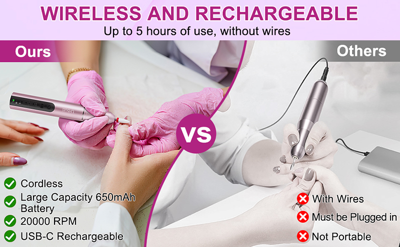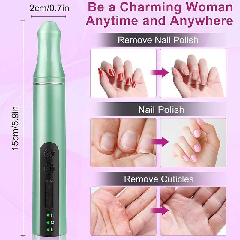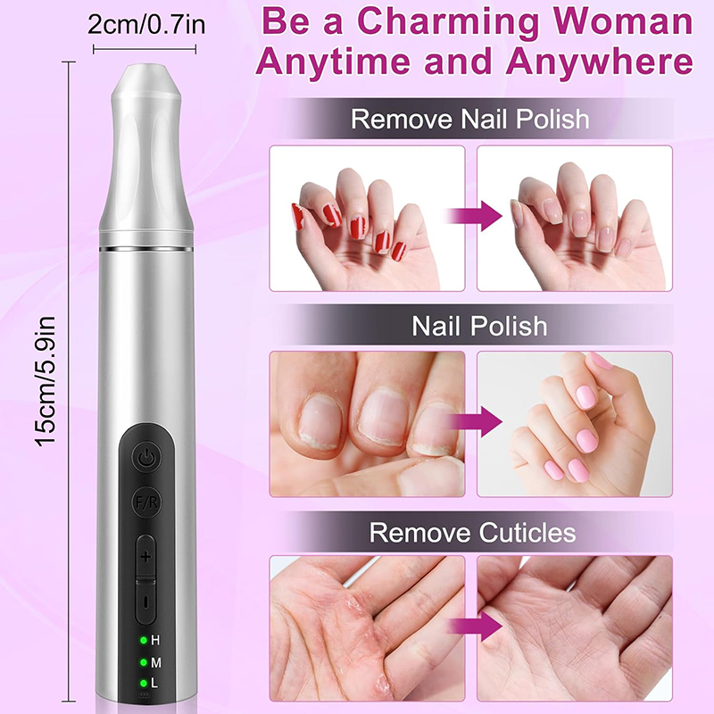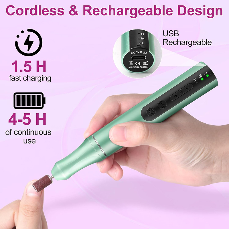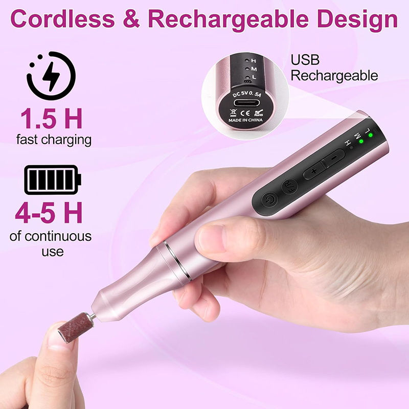 Bušilice za akrilne nokte dizajnirane su da budu lagane (85g) i mogu stati u vašu torbicu ili džep odjeće. Takođe dolazi sa USB kablom za punjenje koji se lako može priključiti na bilo koji USB uređaj radi punjenja, što vam čini pogodnim da uživate u njezi noktiju bilo kada i bilo gde.