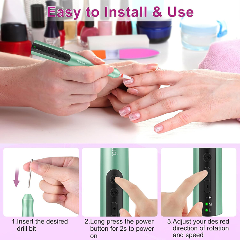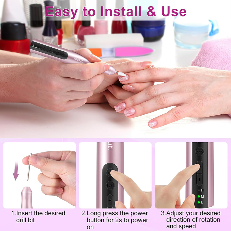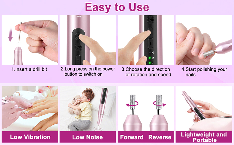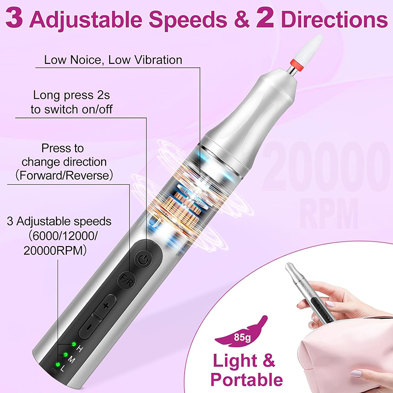 Profesionalne turpije za nokte dizajnirane su sa 3 brzine od 6000-12000-20000, samo kratko pritisnite dugme + ili - da povećate ili smanjite brzinu. Lako se podešava brzina i štedi vrijeme prilikom oštrenja noktiju. Smjer bušilice može se lako promijeniti pritiskom na tipku F/R, idealno za ljevoruke, majstore noktiju ili početnike za njegu noktiju.