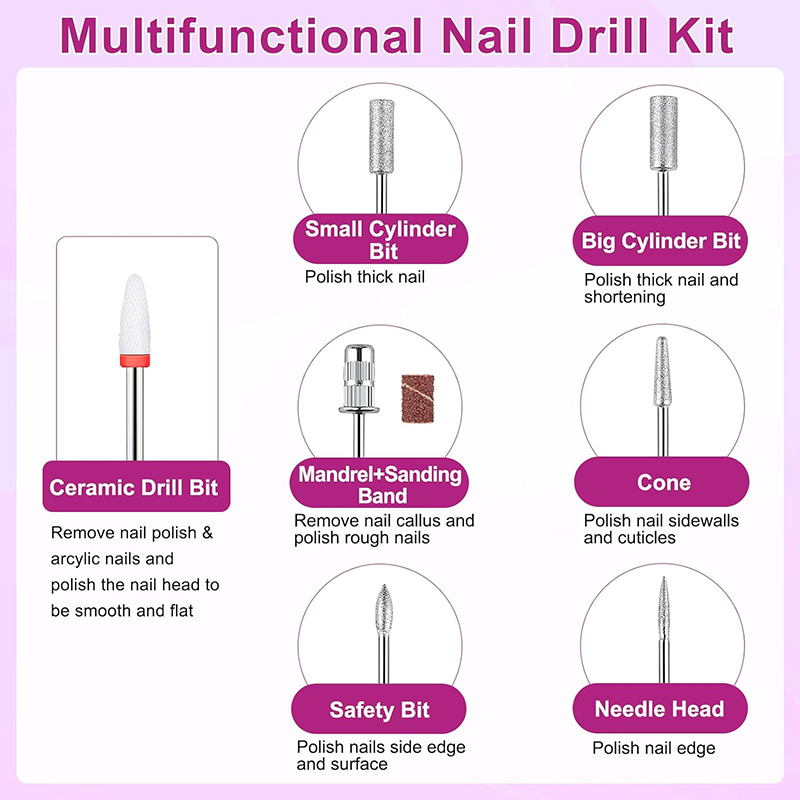 Mašina za bušenje noktiju uključuje 6 burgija za nokte od nerđajućeg čelika, 1 keramičku burgiju i 36 izmenljivih brusnih traka. Komplet za manikuru za pedikir se može koristiti za manikuru, pedikir, poliranje, oblikovanje, brušenje zanoktice, uklanjanje noktiju akrilom/gelom ili za uljepšavanje noktiju. Kompletan s dodacima i jednostavan za korištenje, savršen za početnike u umjetnosti noktiju!