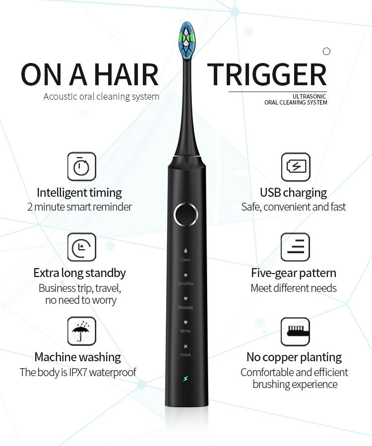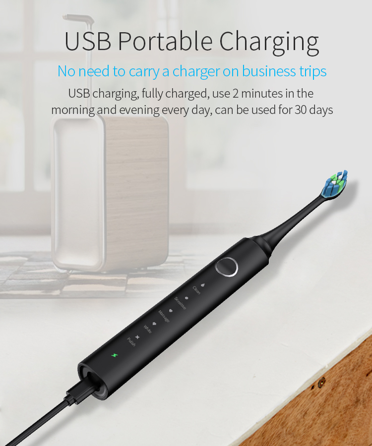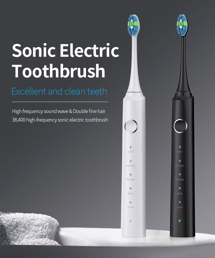 - 5 REŽIMA ČETKA VISOKIH PERFORMANSA- Čisto (nježno), Bijelo (jako), Poljsko (jaka invertna frekvencija), Blaži (nježna invertna frekvencija) i Osjećajno (meko) kako bi odgovarali različitim uvjetima zuba desni, tako da možete odabrati različite načine prema vašim željama i preporukama stomatologa.