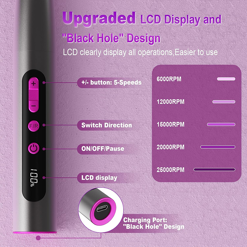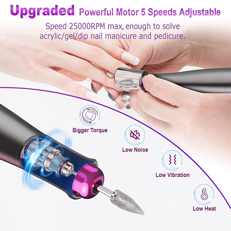 Električna bušilica za nokte Nadograđeni snažan motor savršen je za sve vaše potrebe za manikirom i pedikirom, uključujući uklanjanje akrilnih noktiju, poli gel noktiju, gela za bube, noktiju u prahu, zanoktica, mrtve kože, žuljeva i debelih noktiju.