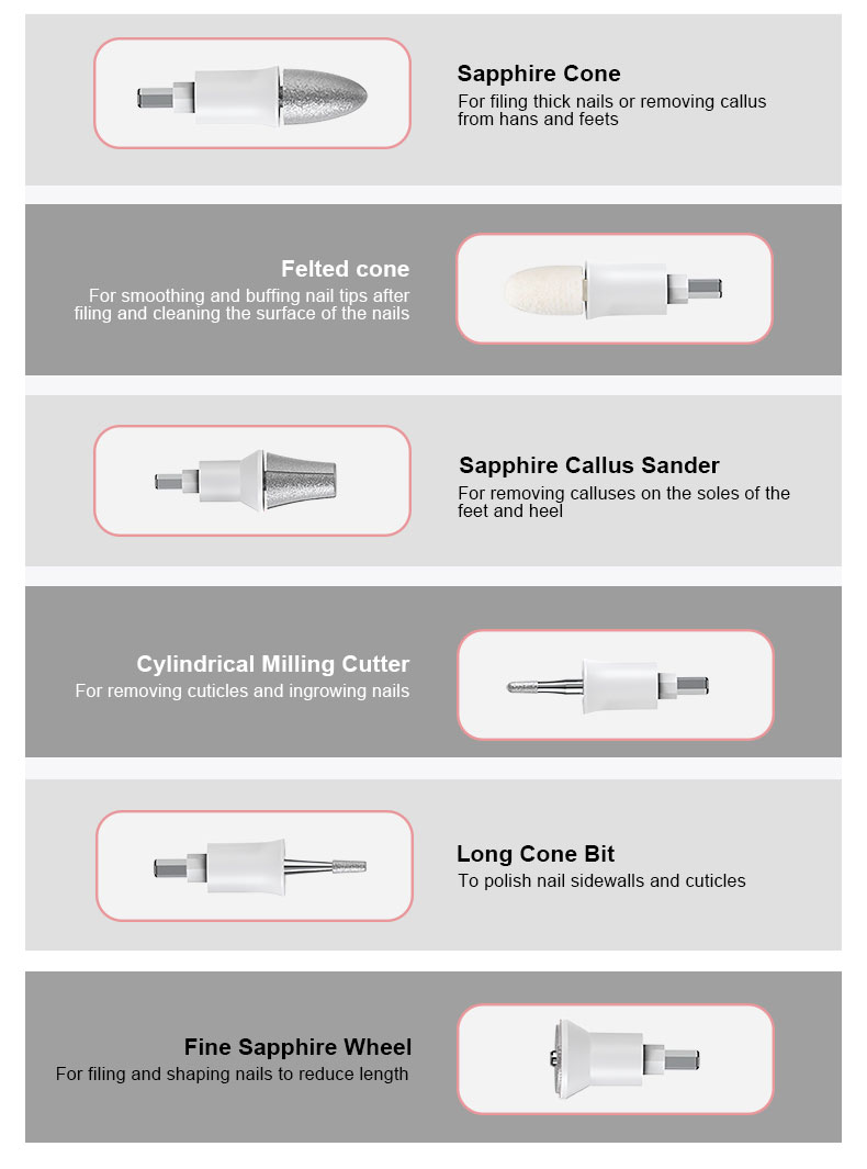 7 HIGH QUALITY ATTACHMENTS: The nail set is packed with 7 different attachments made of sapphire, felt, or sandpaper to get the nails you want – remove cuticles and calluses, even suitable for thick or acrylic nails.