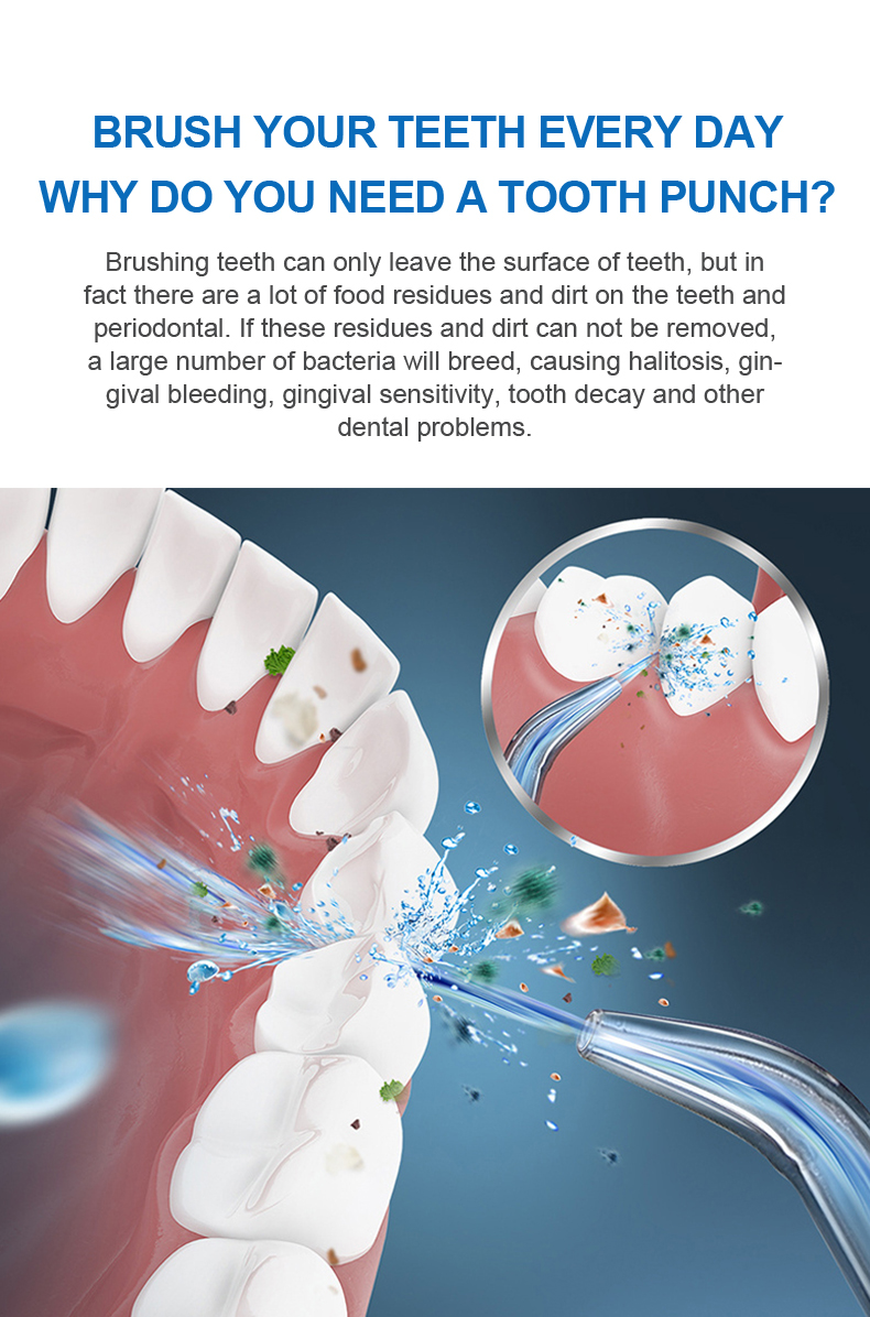 Ovaj vodeni zubni piling daje impulse visokog pritiska vode 1400-1800 puta u minuti, efikasno uklanjajući 99,9% zubnog naslaga za dubinsko čišćenje zuba. Ovaj vodeni zubarski trzaj masira desni, potiče cirkulaciju krvi i rješava oralne probleme poput lošeg zadaha, ortodontskih zuba